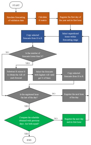 Hourly iterations: For each of the 24 h on the first day of the year, the algorithm selects the N possible values within the forecasting horizon that will reduce the prediction error the most. To do this, it first checks if there are values without prior predictions, and it includes them among the selected ones. In addition, it copies the selected values from matrix H to matrix R as indicated in Equation (6). In this way, matrix Rij contains the expected error of the last prediction made for hour i of future day j. At this point, all values within the horizon have either a current or a previous forecast. Next, if the number of predictions to be calculated is less than N, the rest of the forecasts are prioritized according to their AIE. To do this, according to time k, the submatrix Hij is subtracted from Rij. The models whose difference is greater will be included among those selected and the values of H will be transferred to R until the N predictions are completed. This process is carried out for 24 h until a list of predictions to be calculated for each hour is obtained, so matrix R changes with every hourly iteration.