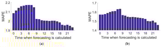 In order to quantify the effect of temperature updates, the MAPE of the entire forecasting horizon has also been calculated for each time of the day when forecasts are calculated. These errors are drawn in Figure 4; in order to distinguish the effects of temperature updates when predicting early morning and the rest of the day, the hours of the day that are predicted have been separated into two graphs.