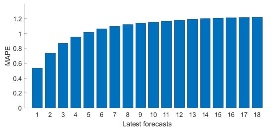 To visualize the impacts that the latest demands have on forecast accuracy, actual temperature registers as opposed to forecasts have been used to avoid confusion between both variables. Figure 6 shows the MAPE made by the latest forecasts, which are distributed on the abscissa axis so that the first one corresponds to the most recent one.