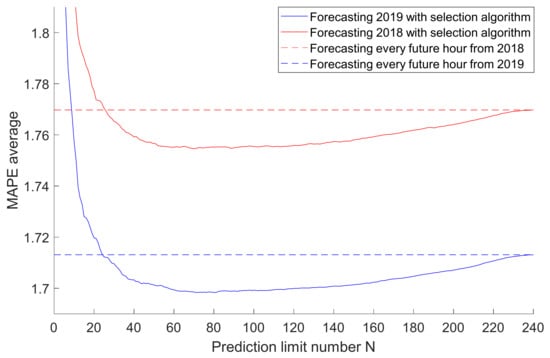 The algorithm has been applied to predict 2018 and 2019; so that to predict 2018, the years from 2011 to 2017 have been used as training and 2018 as validation datasets, while to predict 2019, the years from 2012 to 2018 have been used as training and 2018 as validation datasets. Figure 7 shows the MAPE average for each number of predictions that the system calculates. The solid lines refer to the STLF system with the algorithm applied and the dashed lines to the error made in predicting all the future hours that the system can cover; that is, the entire forecasting horizon, also understood as N equal to 240.