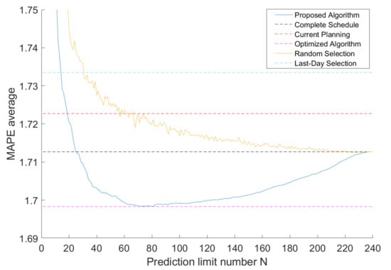 In order to test the proposed algorithm, the year 2019 has been predicted, with each one of the scheduling options explained in Table 2. The MAPE average has been calculated for all the advances of all the hours of the year. Figure 8 shows the mean of the MAPE for each scheduling method. Methods with dashed lines are those that have a predetermined number, N, of future predictions.