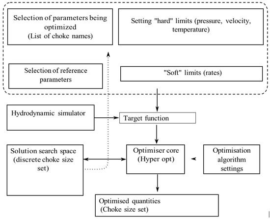 The optimization module for the well process conditions is integrated into the hydraulic calculation [7,8,9]. The optimization result is the selected nominal bores of the surface choke of known producing wells, which ensures the minimum value of the target function. In practice, due to the vast number of variables, the problem of optimizing the well process conditions has a large scale. To solve this, we used the Bayesian optimization algorithm, which considers the data of previous iterations to identify the most promising parameter region.