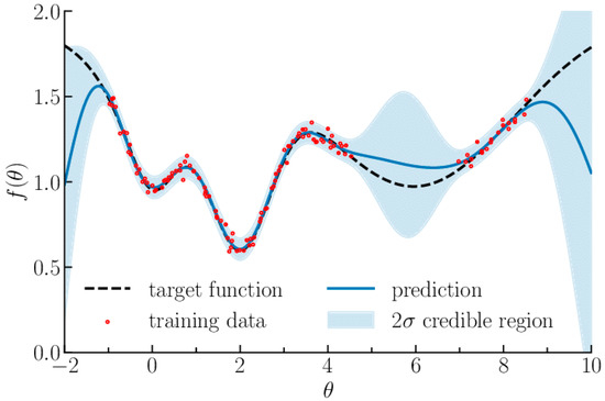 Illustration of the Gaussian process in a one-dimension case for the target function (dashed line). The training set plus Gaussian noise with an RMS deviation of 0.03 is shown by the red dots. The light blue line shows the mean value predicted by the Gaussian process, and the painted area around it is the 2σ error. The illustration is from [16].