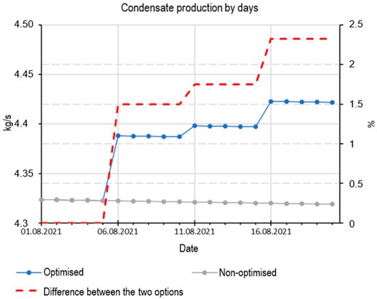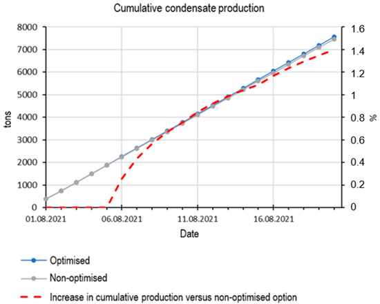 At each optimization step on 6 August 2021, 11 August 2021 and 16 August 2021, an increase in the condensate production was observed, with the above process limits being met, see Figure 4 and Table 2. For the cumulative production plot, refer to Figure 5. At the end of the optimization period, the gain in condensate production was 106 tons, which was 1.4% more than the production in non-optimized conditions.