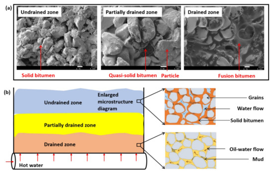 As shown in Figure 1, due to the phase change of bitumen, the wellbore region during the water injection process was separated into 3 different zones, viz. the drained, partially drained, and undrained zones [23]. In the undrained zone, the solid bitumen played the role of structure and cement, supporting a part of shear stress. In the pore surrounded by solid bitumen, water was the only seepage phase (gas was not considered), but the heat convection was weak because of its low permeability to water. In the drained zone, with the hot liquid being squeezed into the reservoir, there were both heat convection and heat conduction. The solid bitumen was transformed into a liquid, and the viscosity of bitumen decreased dramatically. The mobile bitumen and water form the oil–water mixed flow, and meanwhile, the cementation among mineral particles did not work. The adequate contact among mineral particles made the Karamay oil sands form an interlocking structure. Therefore, the shear dilation potential was improved significantly, and the shear-induced fracture and tensile parting-induced fracture were generated.