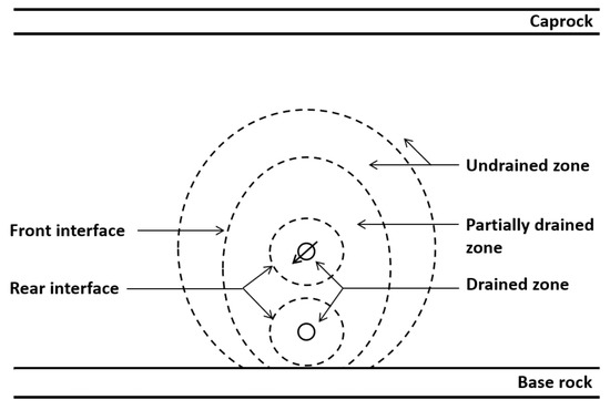 Figure 2 is the formation profile perpendicular to the wellbore extension. The possible phase state of bitumen was displayed under the interference of two wells. During the micro-fracturing stage, inter-well thermal communication (which always happens in the SAGD circulation preheating stage) was not easy to achieve because of the short construction time and low temperature of injection water. Therefore, there were two separate drained zones around the horizontal wells, and the far reservoir was undrained. The area between the undrained and the drained zones is called the partially drained zone, whose outer boundary and inner boundary are called bitumen fusion front and rear interfaces, respectively [19]. The shapes of the partially drained zone depend on the reservoir’s physical properties and construction parameters. The thickness of the Karamay oil sand pay zone is commonly thin, and the impermeable caprock and base rock mudstones maintained a perfect closure for the reservoir in vertical directions. To simplify the three-dimensional geometric model, a regular geometric model was established according to the actual reservoir and closure conditions, as shown in Figure 3.
