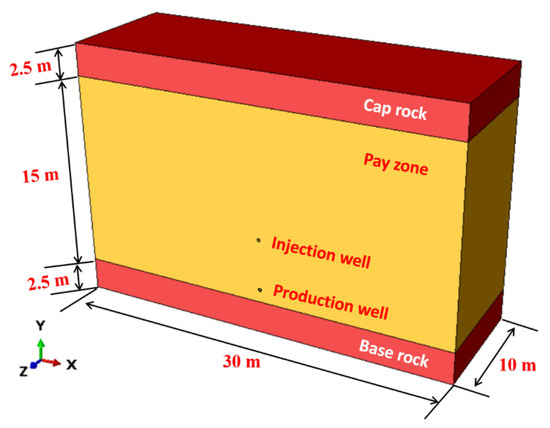 Therefore, the model geometry is described by the following data. The model sizes in the x, y, and z directions are 30 m, 20 m, and 10 m, respectively. The thickness of the pay zone is 15 m, and the thickness of base rock and caprock is 2.5 m. At first, the well is filled with oil sands. Next, the oil sands in the well are removed, and the screen is installed. The oil sand in direct contact with the screen pipe is assumed. The wellbore diameters of the SAGD production well and steam injection well are both 0.125 m. The inner diameter of the screen is 0.159 m.