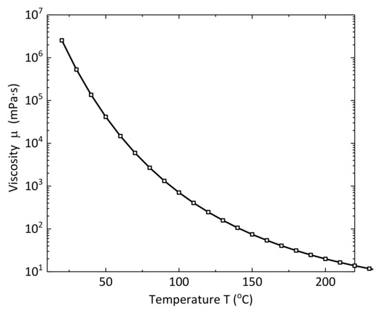 The reference permeability in Equation (15) at 20 °C and zero volumetric strain is 2.886 mD. The permeability at any temperature and volumetric strain can be calculated by Equation (15). The occurrence of volumetric strain is caused by two reasons: first is the shear dilation of oil sand skeleton under shear stress, and second is the tensile parting expansion induced by the decrease of mean effective stress under water injection. As shown in Figure 4, the dynamic viscosity of Karamay bitumen varies with the temperature.