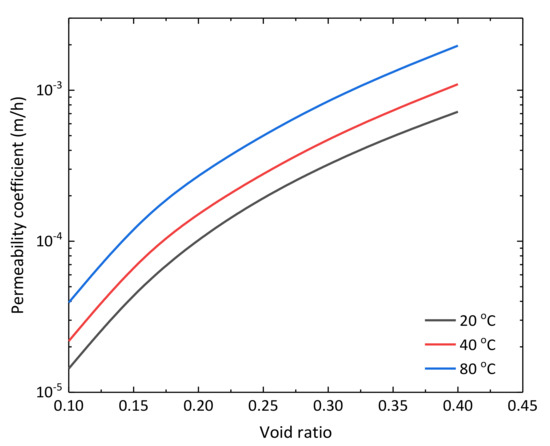 As shown in Figure 5, the permeability coefficient evolved with the volumetric strain or void ratio and temperature in the process of water injection. When the temperature was high, the liquid viscosity became low, therefore, the permeability coefficient was high, which was beneficial to the hot water flowing into the far reservoir. The injected water in the oil field was a by-product of water with a temperature of 70~80 °C [2,3]. The water temperature was not specially heated, but was the natural temperature after treatment. The water used for injection during micro-fracturing was the by-product fluid recycled from previous recovery activities. The treatment mainly contained sedimentation and filtration. The viscosity of water under 70~80 °C was low, so it can maintain a high permeability coefficient. At present, the temperature for water injection is usually between 20~80 °C, and a good effect is proven by field practice.