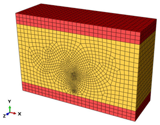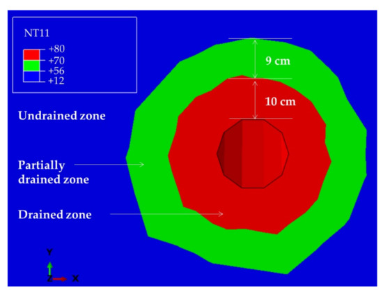 According to the difference in fluid flow, deformation, and temperature propagation properties, the geometric model was partitioned as 5 zones, namely caprock, base rock, pay zone, screen tube, and the wellbore drilled. Only in this way, can we assign different material property parameters for the five meshed zones. Particularly, the reservoir can be further partitioned as 3 zones, namely undrained, partially drained, and drained zones, considering that the geo-mechanical behavior in the process of SAGD is significantly affected by the phase transition of bitumen. The seepage, deformation, and temperature propagation behaviors within the oil sand reservoir exhibit big differences for the geomechanically undrained, partially drained, and drained areas, in which the “phase states” or bitumen viscosity varies a lot [23,25]. We used the temperature-dependent flow and heat transfer parameters to embody this process in the reservoir. In the z-direction, all the zones have the same thickness, which means the geometric model’s division is generated by sweeping along the z-direction.