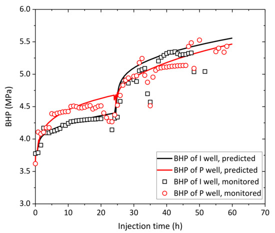 In our study, good model reliability means that the predicted BHPs are just essentially in agreement with the field recorded BHP values. The predicted results are very difficult to quite match the actual data, because of these factors such as the subjective and objective fluctuations in field operations, the heterogeneity of the reservoir’s material, the assumptions and simplification of the numerical models, and the boundary conditions, and so on. For the field engineers, they desire the predicted results within an acceptable range. As shown in Figure 7, the field recorded BHP values are relatively irregular including some dips and scatters, which may result from the fluctuation of wellhead operation pressure. Besides, the raised BHP may cause fracturing of certain thin lenses, generating preferential flow paths in the reservoir and connecting natural fractures or weak planes [2], which may lead to a sudden drop in BHP. In addition, there are some dips and scatters during 35~58 h because we used a simplified constant injection rate for the simulation. For instance, the I well and P well were injected at the constant average rates of 113.6 and 71.2 m3/day during 35~58 h, respectively. If we divide 35~58 h into several or a dozen periods, the matching degree may be better theoretically, but the workload will increase and it is not necessary for engineers.