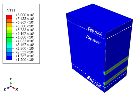 Figure 8 shows the reservoir temperature distribution after water injection. The reservoir in the well-around region is heated by both heat conduction and heat convection effects. However, there were only two narrow separate zones in which temperature changed effectively because of the weak heat convection induced by a low permeability to water (<3 mD) [14], relatively low injection temperature (about 80 °C), and a short injection period (<3 days).
