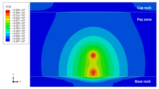 As shown in Figure 10, the BHP increased to 5.6 MPa from 3.62 MPa (the initial reservoir pore pressure). The BHP around the I well was slightly higher than that around the P well, because the injection rate in the I well was higher. It is worth noting that the reservoir pore pressure after operation must be about 0.5 MPa lower than the reservoir cracking pressure to prevent the two wells from inter-well breakdown [32]. The pore pressure of mudstone base rock right under the P well increased significantly, which illustrates that the mudstone interlayers or stringers may be broken through by the water injection operation near the mudstone. Considering the interferences induced by both two wells and mudstone caprock/base rock, the reservoir pore pressure isoline exhibited a shape of semi-ellipse that is symmetric to the mudstone base rock.