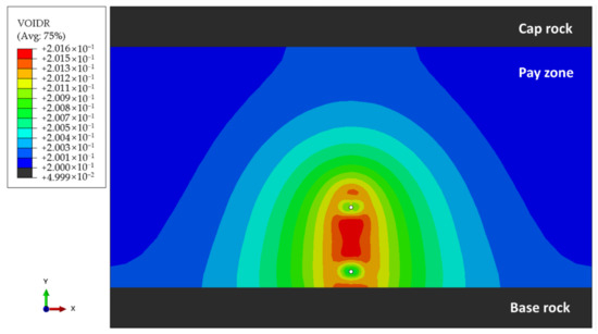 The void ratio is defined as the ratio of pore volume and solid particle volume. As shown in Figure 11, the void ratio in the reservoir had a small improvement after water injection, especially in the inter-well zone, where the volumetric strain changed from 0 to 0.167%, and the void ratio changed from 0.2 to 0.202. The well-around zone owned a relatively smaller void ratio than the inter-well zone. Generally, the void ratio improvement zone induced by water injection showed a shape of a large quasi semi-ellipse. Compared with the study of Lin et al. [2], the largest volumetric dilation did not occur on the well wall if the transient heat transfer and bitumen state around the wellbore were incorporated. The increase in void ratio meant the increase of both reservoir porosity and permeability, which provided the advantageous flow channel for steam in the subsequent cyclic production and preheating phases.
