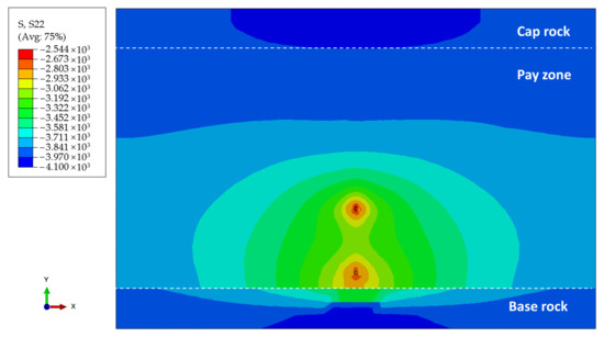 As shown in Figure 14, the reservoir vertical stress changed from 3.98 MPa everywhere to uneven distribution. The well-around region possessed lower vertical stress (as low as 2.54 MPa), while the far reservoir had a higher value.