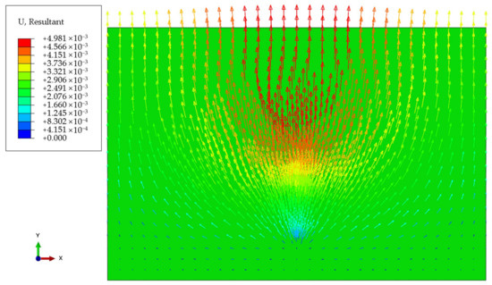 As shown in Figure 16, the reservoir uplift is caused by water injection. The vertical displacement in the plane perpendicular to the wellbore is symmetrical about the connection between the two wells. The largest displacement reached about 5 cm, and the largest uplift took place in the zone right above the two wells. The displacement along the wellbore was very small, and it can be neglected.