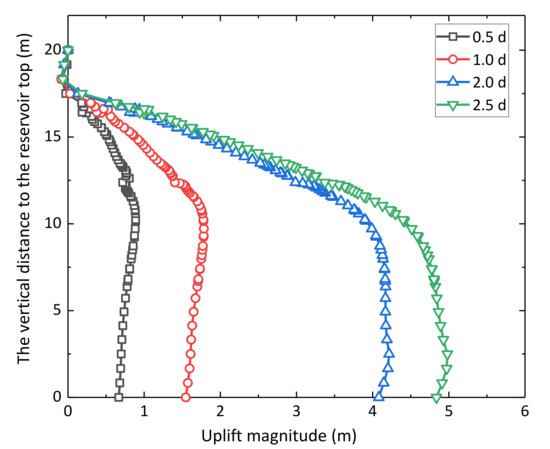 The field monitored data shows that there is a slight uplift on the ground after water injection. To observe the reservoir uplift information at different depths, a vertical line was established through the two wells from the reservoir top to bottom. Figure 17 displays the vertical displacement along the vertical line. It can be observed that the uplift magnitude increased sharply from the reservoir bottom to the middle of the reservoir, then the uplift magnitude went up slowly from the middle of the reservoir. The phenomenon of reservoir uplift verified the mechanism of water injection-induced dilation. The uplift was relatively small because of the short injection period and low water temperature. In the next study, the ground uplift magnitude and caprock stability will be focused on under the condition of long-term high-temperature steam injection.