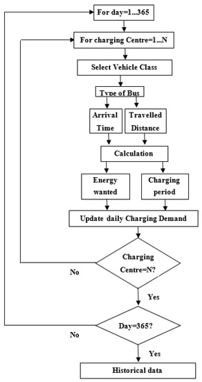 The algorithm used for generating the historical dataset is given in Figure 3. In our approach, the charging datasets were created separately for all the charging centers (only depot charging was considered). The energy consumed and charging time of the e-buses depended on the arrival time and the state of charge (SOC) of the buses. The SOC was dependent on the distances travelled by the buses [47].