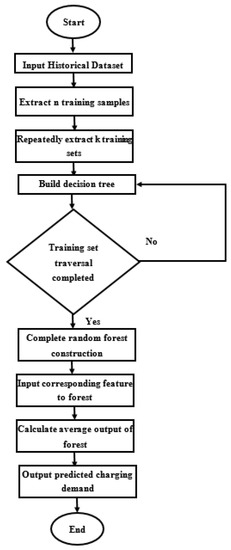 The charging demand prediction made by the random forest model is elaborated in Section 2. The random forest is based on ensemble learning, which combines multiple classifiers for dealing with an intricate problem. A random forest contains a number of decision trees on different subsets of the datasets. It takes the mean to improve overall prediction accuracy of the given dataset [38,39]. A random forest takes the prediction from each tree and, based on the majority votes of the predictions, it can predict the final output [38]. The prediction accuracy of the random forest is directly proportional to the number of trees. Our step-by-step approach for the charging demand prediction is shown in Figure 4.