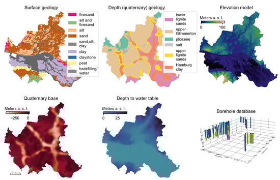 Visualization of the six input data types (Table 1) for the federal state of Hamburg. Borehole data is shown for a small sub-region only.