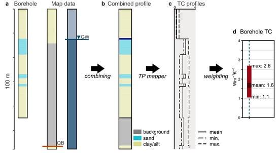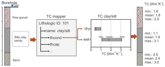 The TP mapper obtains its data from a thermal property database, in this study, the German guideline VDI 4640 sheet 1 [37]. It provides a collection of measurement-based values of thermal conductivity, heat capacity and density for 30 rock types, grouped by unconsolidated, sedimentary, magmatic and metamorphic rocks. For unconsolidated rocks, the VDI 4640 distinguishes between wet and dry rock, as here in particular the thermal properties depend on the water saturation. For every rock type and saturation, a recommended (mean), a minimal and maximal thermal conductivity are available. When the TP mapper is applied to a stratigraphic sequence, e.g., from a borehole interval, each interval is assigned three thermal conductivity values (mean, min., and max., Figure 2). The structure of the TP mapper allows for an easy addition or replacement of rock properties, for example, with other thermal property databases (e.g., [39]) or laboratory measurements.