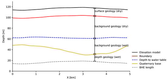 A large-scale estimate of the thermal conductivity in an area, e.g., for Hamburg, is obtained using the cartographic data only. The two geological maps (surface and depth geology) provide a large-scale overview of lithologies at the surface and the quaternary base. Assigning TC values to lithologies in geological maps is a simple and common method to obtain the TC distribution of larger areas (e.g., [31]). This approach is modified to use both geological maps as input. For that, the maps and their elevation data are combined in a plane model. This results in a pseudo-3-D model where the surface geology extends from the topography to the quaternary base, and the depth geology from the quaternary base to the BHE length (Figure 3). In regions with a deep Quaternary base, this leads to a thick sequence of pre-quaternary geology that is not realistic. Thus, we assume that the surface geology extends only to a depth of 15 m. Although the depth is arbitrarily chosen, it is considered a good compromise between accounting for surface geologic features on the one hand and avoiding unrealistically thick surface sediments on the other. After a depth of 15 m, we assign a mean value of all lithologic units at the surface as a background value. Next, the three units (surface geology, background geology, and depth geology) in the layer model are split into their “wet” and “dry” parts using the groundwater data (Figure 3). This allows the determination of the apparent thickness of each of the six units at every location on a m raster covering the entire area of Hamburg. The apparent thickness at each location is input to the TP mapper, and the resulting thermal conductivities are weighted with the unit thickness, thus yielding the min., mean and max. thermal conductivity.