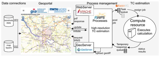 In the geoportal, the user can draw a target area, which is used as a boundary to access the data from the OWS. Furthermore, additional parameters can be submitted, such as the BHE length. When the user initiates the computation, the geoportal requests data within the target area from the geodata servers. Next, it constructs a WPS request, containing both user-defined input parameters and requested data. The WPS is forwarded to a server that operates the PyWPS. The task is then sent to a RabbitMQ message broker, which mediates it further to the processing unit where the high-resolution TC estimation takes place. Progress messages are communicated back via the message broker and stored at the PyWPS server so that the geoportal can request the process status.