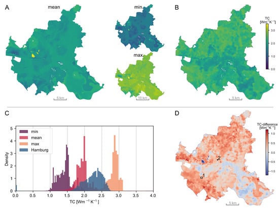 The large-scale TC estimation workflow using data from Hamburg reveals the minimum, mean and maximum thermal conductivity up to a depth of 100 m (TCls, Figure 6A). The spatial distribution of thermal conductivity corresponds to characteristic boundaries in the cartographic data, e.g., boundaries of geological units in the surface geological map (compare Figure 1). Lowest thermal conductivity values are reached in the south, where the depth to water table is highest. The mean (TCls-mean) distributes around