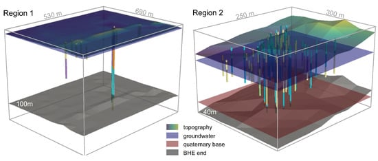 For both regions, the data (i.e., borehole intervals, depth to water table, quaternary base and geological maps) were requested from the geodata servers and combined in a 3-D block model for visualization and data quality control (Figure 7). Region 1 has an area of 0.37 km2. Eleven boreholes are longer than 15 m, of which three cover the entire BHE length of 100 m. The groundwater level is right below the surface and the quaternary base is deeper than 100 m. Region 2 extends over an area of 0.08 km2. Fifty-three boreholes longer than 15 m are openly available. The groundwater table is around 10 m below the surface and the quaternary base at 30–40 m. Here, seven boreholes cover the entire BHE length of 40 m.