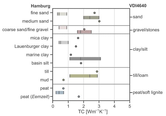 Comparison of laboratory measured thermal conductivity values in the Hamburg area [50] (dots) and corresponding min.-mean-max. ranges (bars) for both water-saturated (bright colors) and dry (pale colors) conditions from the VDI 4640 [37]. For till and peat, the VDI does not distinguish between saturated and dry conditions.