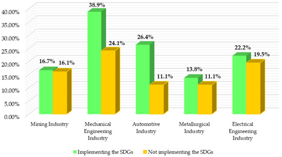 Figure 2 shows the SDGs implementation in enterprises in the selected industry sectors. Based on the results summarised in the bar chart, we conclude that the highest SDGs implementation is in the mechanical engineering industry (38.90%). The automotive industry also has a high percentage (26.40%). The SDGs are enforced in the electrical engineering industry enterprises at 22.20%. Sustainable development goals are least implemented in enterprises of the mining industry (16.70%) and enterprises of the metallurgical industry (13.80%). At the same time, based on the graphical visualisation of the data, we conclude that the SDGs are dominant in every type of industry that was part of the research sample.
