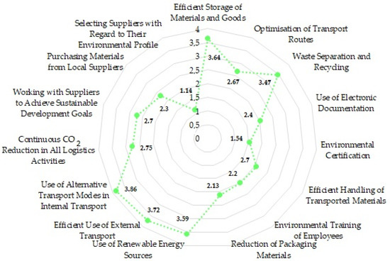 The sustainability in production and logistics processes is illustrated in Figure 3. It represents multivariate descriptive statistics in the form of a radar chart. This graph shows the mean values that emerged on a scale of 0 to 6, with the scale of 0 indicating that the manufacturing enterprises do not use SDGs in the production/logistics process and the scale of 6 indicating that the enterprises make high use of the production/logistics process. According to the data, the use of alternative transport modes in internal transport is of the highest importance weight (3.86) for manufacturing enterprises. Processes that also obtained high mean value values were: efficient use of external transport (3.72), efficient storage of materials and goods (3.64), use of renewable energy sources (3.59), and waste separation and recycling (3.47). The radar chart shows that the mean values are similar in the following processes: continuous CO2 reduction in all logistics activities (2.75), working with suppliers to achieve the SDGs (2.7), and optimisation of the transport routes (2.67). Sustainability in production and logistics processes in manufacturing enterprises was obtained with the lowest average values for the processes: environmental certification (1.54) and supplier selection according to their environmental profile (1.14).