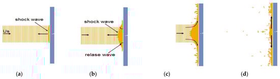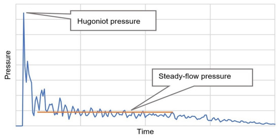The impact process consists of four main phases presented in Figure 1: (a) initial shock at contact, (b) impact shock decay (c) steady flow and (d) pressure decay. After the impact, a shock wave is created. This wave is parallel to the surface and runs perpendicularly from the surface in line with the direction of the bird’s body. The pressure exerted by the running shock wave on the inner side of the bird body’s surface combined with a negligible pressure outside creates a high pressure gradient. The particles in the area subjected to pressure gradient are spread radially outward. This creates release waves proceeding radially in the direction of the central axis of the model. The intersection of the release waves results in the rapid decrease in pressure in the center of the impact. The combination of the convergence of the release waves and their interaction with the shock wave shortens the Hugoniot pressure peak time by not even a microsecond. The mutual interaction of the waves causes their gradual weakening, which leads to the steady flow pressure in the bird’s body. Next, when all of the bird body’s particles have hit the target, the pressure drops to zero and the impact is terminated. The length of the bird’s body has a significant effect on the time of the impact process, especially in the aspect of the duration of the steady flow existence. The results of the experimental tests found that the ratio of the length to diameter equaling about 2, for the bird models in a shape of a cylinder, is advised for both numerical and experimental studies [17,19,25]. A typical pressure curve for a bird model impact on a rigid plate is depicted in Figure 2.
