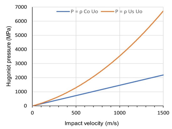 For impact velocities, up to about 150 m/s, the shock velocity, us, can be adopted as the speed of sound in the material, c0. Thus, Equation (5) can be expressed as follows: