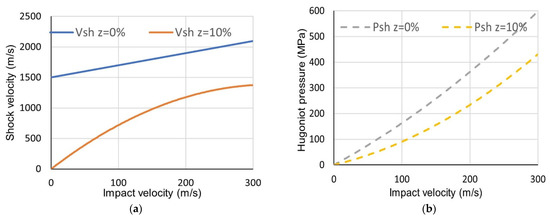 Theoretical results for shock velocity (a) and shock pressure (b) with different porosity. Adapted from Ref. [19].