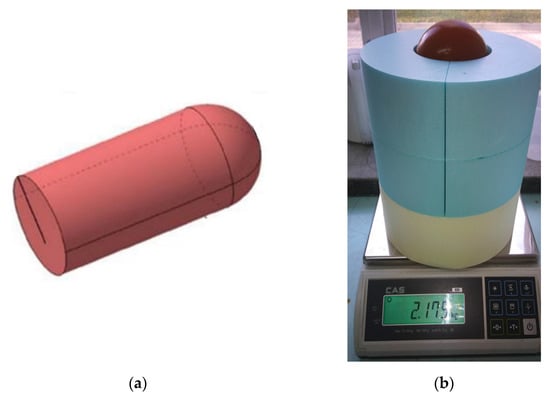 Ten shots were fired during the experimental tests. Shots no. 4 and 9 have been chosen for the presented analyses. The projectiles were made on the basis of NASA regulation TN-2015-218340. Depending on the weight, the projectiles had the following dimensions: diameter—106 mm, length—212 mm; weight 1.81 kg (Figure 7a). For each shot, a sabot made from styrodur xps with an external diameter of 250 mm was prepared. Before each shot, the sabot and the gelatin projectile (Figure 7b) were weighed. In this study, the projectile velocity was 116 m/s (±5 m/s).