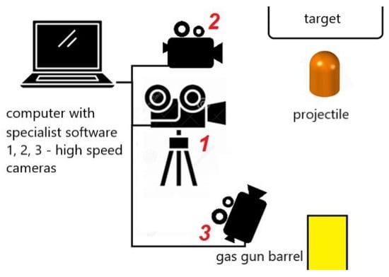 Figure 8 shows the experimental setup elements exploited during tests. Camera no. 1 was used to determine the projectile velocity. Camera no. 2 recorded the target displacement. Camera no. 3 was used to observe the impact process.