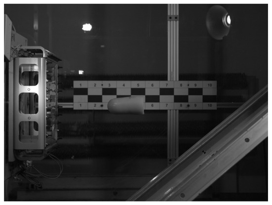Figure 9 presents a projectile shot toward the target plate. The projectiles’ velocities were calculated based on the video analysis exploiting the calibration mark visible in the background.