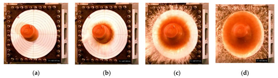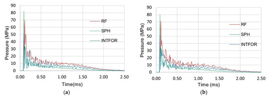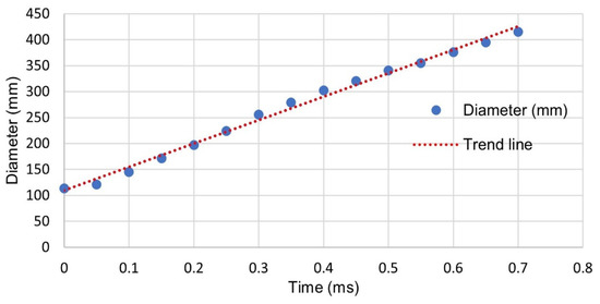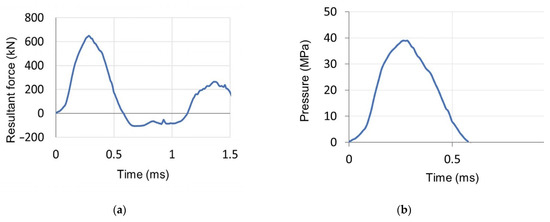 This equation was used to calculate the “theoretic diameter”, on the basis of which the pressure of the projectile acting on the plate was calculated at subsequent time moments corresponding to the sampling of the force measurement. The pressure was calculated based on Equation (15):