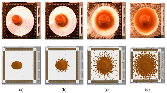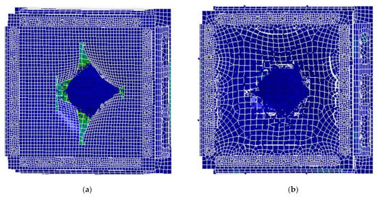 Figure 34 depicts a comparison of the projectiles’ deformation during the impact into the target plate, recorded by a high-speed camera, with the corresponding numerical simulation results. It can be noted that the simulation reflects satisfyingly the deformation of the gelatin bird model during the bird impact process. However, taking into consideration the behavior of the plexiglass plate, it can be seen that in the numerical simulation, the plexiglass plate is more elastic in comparison to the experiment, in which the plexiglass plate seems to be more brittle. Zochowski et al. obtained a good brittleness effect of the ceramic plate during numerical simulations [60].