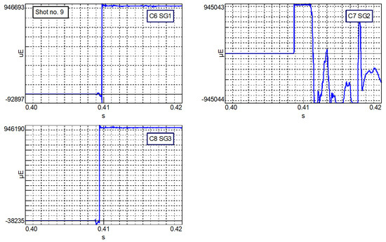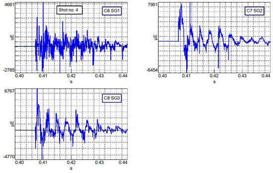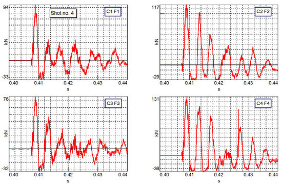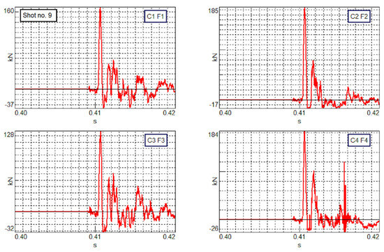 For each shot, the values of forces measured by 4 load sensors (F1, F2, F3, F4) and the values of strains measured by strain gauges (SG1, SG2, SG3) were recorded. In addition, the speed of the projectile, the view of individual sequences of the projectile’s strains and the diameter of the deformed projectile were recorded with a set of cameras, on the basis of a grid of circles placed on the rigid plate. The diameter was measured for each subsequent frame of the film recorded by the cameras. The registration of the above data allowed the developing of graphs of the total force, strain values and pressure. In order to achieve a temporary synchronization of the indications of the force sensors with the measurement of the projectile diameter, the analysis was started when the sum of the measured forces increased significantly above the zero value. Based on the data presented in Figure 10, the equation of the relationship of the mid-diameter change (linear) was determined.