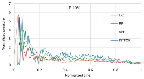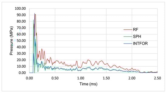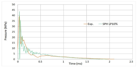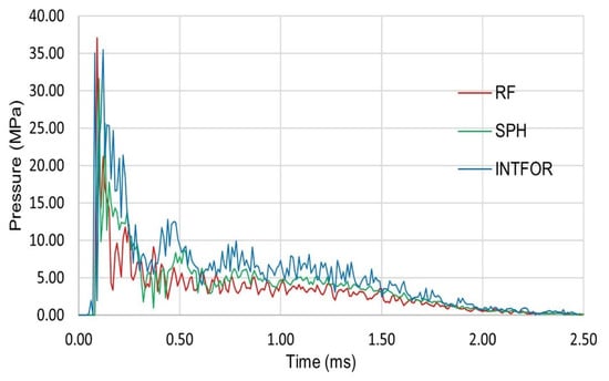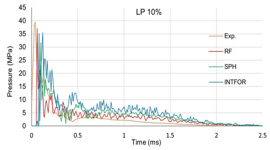 One of the goals of the experiments was to determine the material properties that best reflect the behavior of the bird’s actual body during impact. For this purpose, the pressure distribution was expressed as a function of pressure value and time, depending on the material. It was found that a projectile made of gelatin with a porosity of 10% reflects the properties of a real bird the most accurately. Moreover, it was determined that at a high velocity of impact, the gelatin projectile behaves like water in high stress. Therefore, during the numerical modeling of birds, the material properties of water were assumed [19].