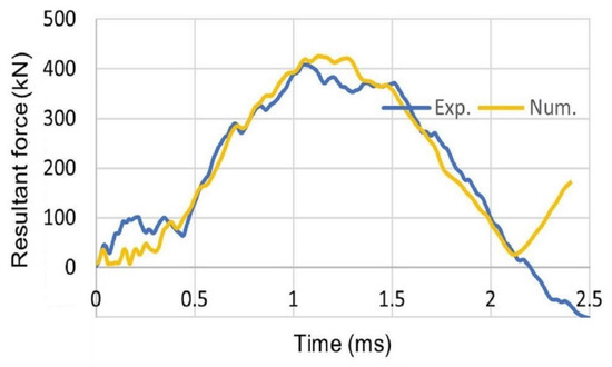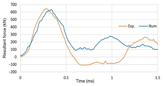 An example of a comparison between the experimental and numerical investigations regarding windshields (a polycarbonate plate of 8 mm in thickness) has been presented in studies [40]. A dead chicken was used as a bird model impacting with a windshield. The impact velocity was 128 m/s. The values of the contact force and the deflection were recorded and compared to numerical analyses. A deep deflection of the polycarbonate plate and an its elastic behavior were observed. It could be stated that the polycarbonate plate is a flexible material [7,40].