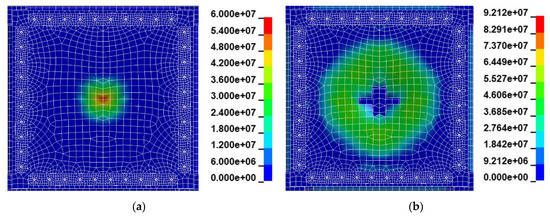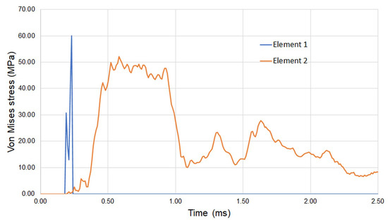 Figure 33 depicts the plot presenting the distributions of the Von Mises stresses of two elements, one is located in the center of the plate and the other is located 0.1 m from the center. The location of element no. 1 was chosen to show the course of the stress in the moment of the puncture. It can be observed that the maximum value of the stress (60 MPa) in element no. 1 occurs at the moment of the puncture, and it coincides with the value shown in Figure 32a. After the puncture the stress rapidly decreases to zero, the same situation is shown in Figure 32b. Taking into account element no. 2, which is 0.1 m far from the center, the course of the stress curve is different. The maximum value of the stress is an average 45 MPa and lasts about 0.5 ms, and next oscillates from 10 to 25 MPa. In this time, elements are damaged, and the process of the deformation is continued to the end of the impact.