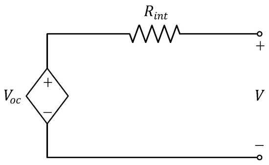 For lithium-ion batteries, this study selects the internal resistance equivalent circuit model, which has fewer parameters. Figure 2 shows a typical battery internal resistance model where represents internal resistance and is the open circuit voltage.