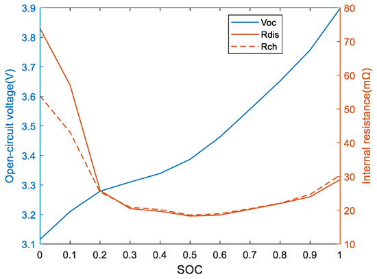 This characteristic can be found in the data sheet of the studied battery, or obtained from experimental tests [11]. Figure 3 shows the open circuit voltage and internal resistance as a function of , where represents the discharge resistance of battery and represents the charge resistance of the battery.