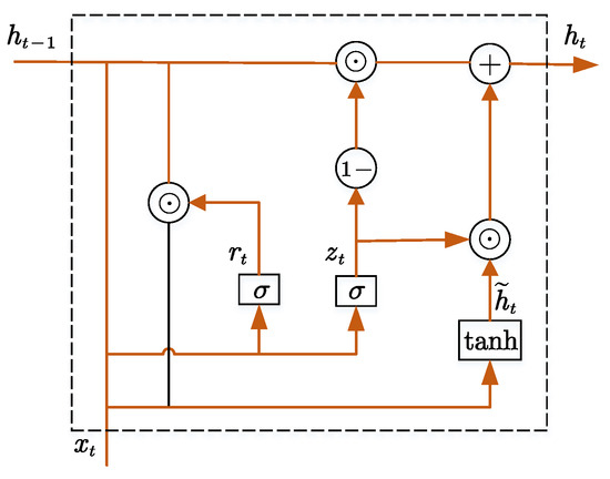 The GRU belongs to a kind of RNN network, an improved and optimized neural network based on the LSTM network, which is a kind of recurrent neural network and can predict for time series. It has a faster convergence speed and has an accuracy close to that of LSTM [19,20]. It realizes controllable memory in time series and improves the problem of the insufficient long-term memory of RNN. There are only two gate structures in GRU, namely, update gate and reset gate. The specific structure is shown in Figure 5.