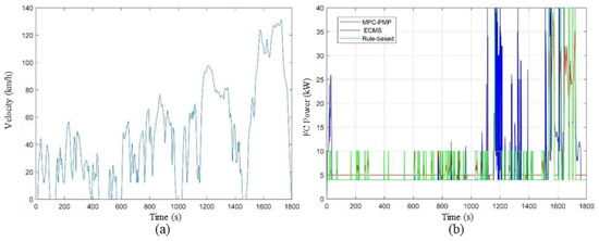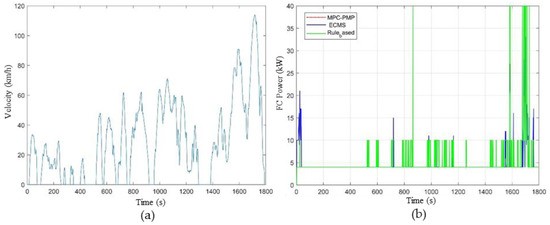 In Figure 9, (a) is the test conditions, and (b) is the fuel cell output power under the three power splitting algorithms, which are identified with different colors: the red curve represents the fuel cell output power in the MPC-PMP strategy, the blue curve represents the fuel cell output power in the ECMS strategy, and the green curve represents fuel cell output power in the rule-based splitting strategy.