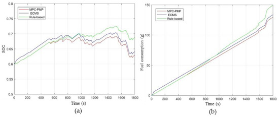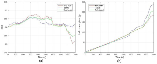 In Figure 12, (a) shows the changing process of the battery SOC under the three strategies, and (b) is the hydrogen consumption of the fuel cell under the three power distribution strategies. It can be seen that in a complete driving cycle, the hydrogen consumption under the MPC-PMP strategy is the lowest. The specific fuel consumption and SOC fluctuations are shown in Table 5.