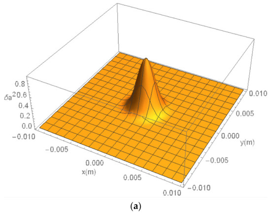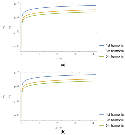 Figure 5a,b, in the single-beam oscillator system. The harmonic field’s intensity of polarized radiation of the fundamental mode for this work showed a difference of approximately 3.3% compared to that obtained using the Genesis simulation in a single-beam configuration. The difference was due to the different formalism between our work with the higher-energy beam alone in the two-beam system and Genesis with a single-beam system, the number of grid points, and the mesh size, etc., in the simulations. The main difference was that the Genesis code used the wiggler-averaged-orbit approximation with a grid-based field solver. However, our code integrated the Newton–Lorentz equations with a Gaussian-mode superposition for the optical fields.